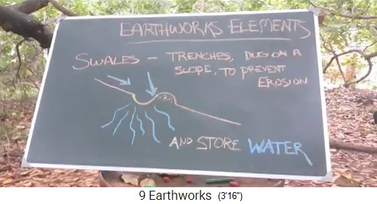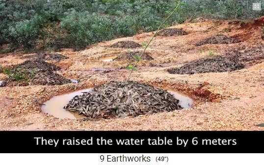 Trockene Hänge werden mit kleinen Gräben und Dämmen wiederbelebt, die bewirken, dass das seltene Regenwasser nicht mehr den trockenen, harten Hang runterfliesst und verlorengeht, sondern ins Erdreich einsickert. Dies ist das Prinzip von Sekar im Permakulturzentrum "Magic House" in Indien: Wasser einfangen, abbremsen, aufsaugen, in der Erde speichern (engl.: "catch, slow, soak, store water in the soil") [web10 - 16-26''].