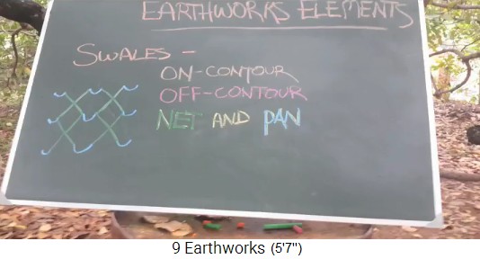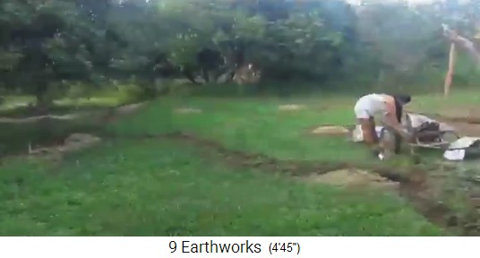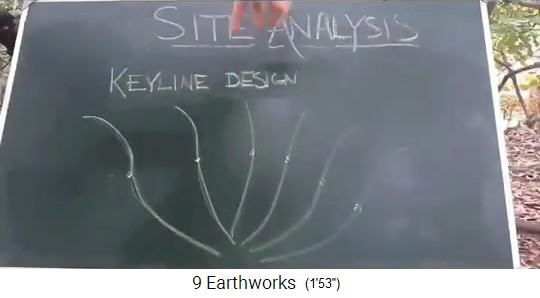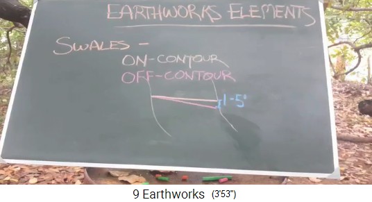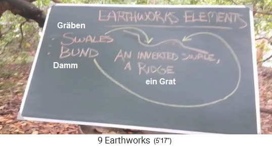 [13,14] Kleiner Graben und Damm am Hang, wo das Regenwasser versickert: Video: 9 Earthworks (10min.): https://www.youtube.com/watch?v=oeAHynOPw-o
