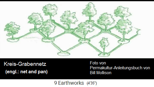 Bill Mollision entwarf das Netz-und-Pfannen-Grabensystem ("net and pan"): Um jeden Baum wird ein runder Graben angelegt (4'42''), und dann werden alle Baumgräben miteinander verbunden, so dass ein Netz entsteht (4'48''). Mit Mulch in den Sickergräben wird die Verdunstung minimiert und das meiste Regenwasser erreicht die gesamten Wurzelbereiche der Bäume (5'4'').