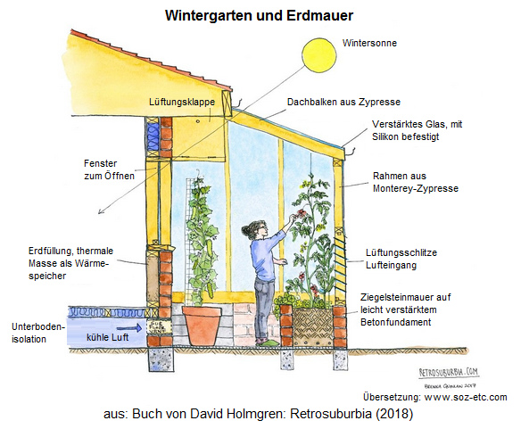 [14] Holmgren: Retrosuburbia, Wintergarten und Innenwand mit Erdschicht verstärkt (Tonziegel), Grafik: