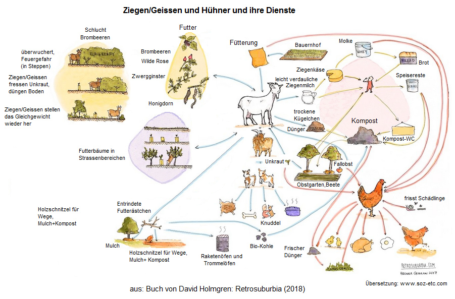 [17] David Holmgren, Buch "Retrosuburbia" 2018: Ziegen / Geissen und Hühner und ihre Dienste, Grafik: