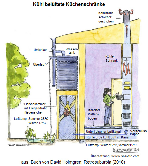 David Holmgren "Retrosuburbia", Architektur: Kühle Ventilation in den Küchenschränken, Grafik [26]: Luft wird durch eine unterirdische Leitung geführt, kühlt dort ab und tritt dann von unten her in die Schränke ein. - Kühl belüftete Küchenschränke in der Küche [27]