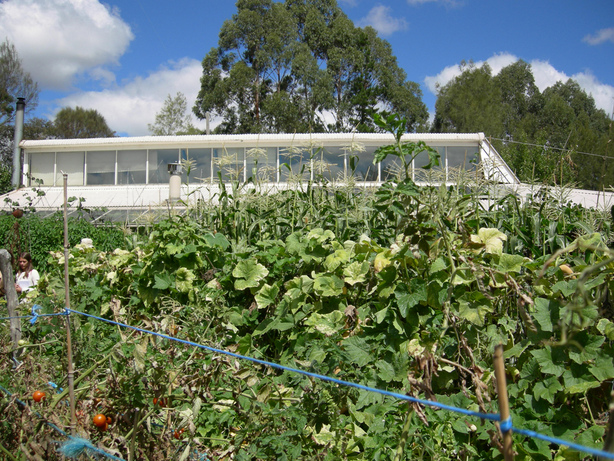 Permakultur-Forschungsinstitut Melliodora: Das Haupthaus mit seinem vertikalem Garten [20] - Melliodora, Teich und der Obstgarten im Hintergrund [22] - Melliodora, Gemüsebeet, Terrassen und Kiesweg [23] - Melliodora, Gemüsegarten mit dem Haupthaus im Hintergrund [28]