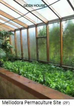 Melliodora 3 wöchiges Volontariat, der Treibhausbereich im Wohnhaus [40] - schwarze Hühner [43] - Gartenbeete mit gemischtem Anbau [46] - Gartenhaus am Teich [51]