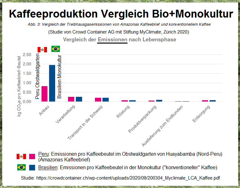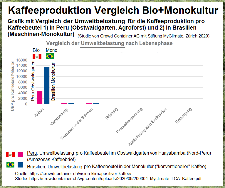 Es stellte sich heraus, dass der Produktionsaufwand bei den Kaffee-Monokulturen in Brasilien dreimal so hoch ist wie beim Kaffee-Obstwaldgarten in Peru. Der Transportaufwand von Peru nach Europa ist dazu im Vergleich minim: