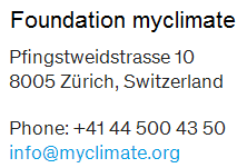 [13] Impressum der Stiftung MyClimate in Zürich: https://www.myclimate.org/information/about-myclimate/contact/