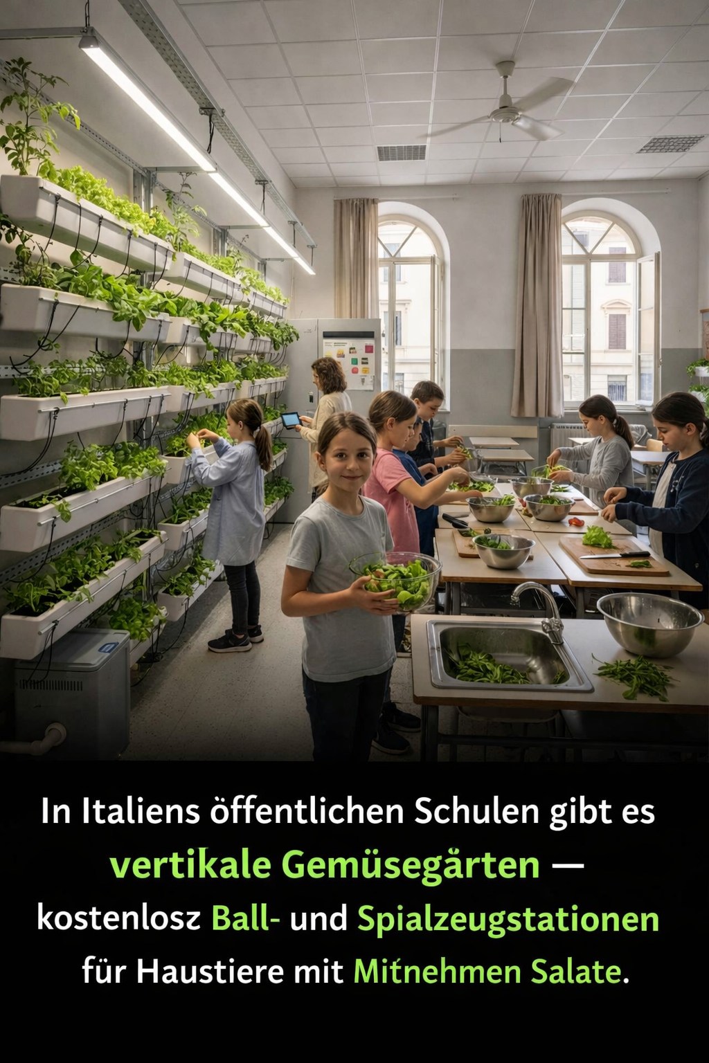 In Italien holen einige öffentliche Schulen die Landwirtschaft buchstäblich ins Klassenzimmer. Vertikale Gemüsegärten, die an Klassenzimmerwänden oder in Fensternähe angebracht sind, ermöglichen es den Schülerinnen und Schülern, Blattgemüse, Kräuter und Gemüse direkt am Lernort anzubauen. Diese Indoor-Gärten nutzen vertikale Regalsysteme, Hydrokultur oder erdgebundene Pflanzgefäße, um den begrenzten Platz optimal zu nutzen und Wände in lebendige, essbare Ökosysteme zu verwandeln.