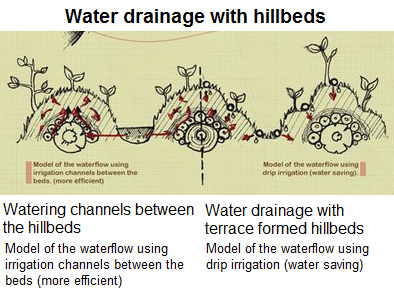 [web31] Permakultur, der Wasserfluss am Hügelbeet mit Kanal zwischen den Hügelbeeten oder Terrassierung: