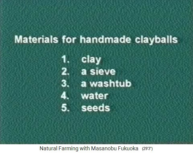 The seed balls were reinvented by Fukuoka after years of trials and failures. Birds or insects have no access to the seeds in the clay balls, and there is no need to plow the field. The only thing one has to do is to make these seedballs (28'51''). The materials for making the seed balls are: