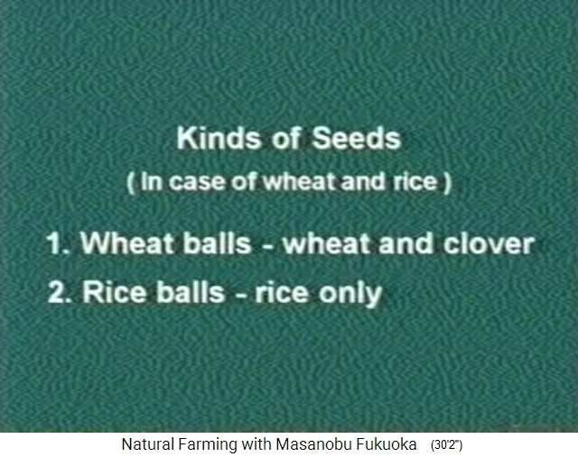 1. Fukuoka and his organic forest garden farm on Shikoku Island (Japan) 1998 - awards -- 2. Fukuoka in India 1997 -- 3. India + Japan: The crop rotation barley+white clover and rice alone - at the organic farm of Fukuoka - doubling the harvest in 30 years -- Shikoku Island (Japan): seed balls - harvest - straw mulch - new crop rotation is growing up with new white clover -- Shikoku Island (Japan): Doubling the fertility of the soil in 30 years -- 4. 1997 Workshop in India: Making seed balls:  Making seed balls 01: for the forest garden - or for cereal cultivation -- Production of the seed balls: for cereal cultivation -- Making seed balls 03: By hand   -- Making seed balls 04: With a concrete mixer -- 5. 1998: Fukuoka in Greece in Edessa - sowing with seed balls -- 6. 1997: Workshop in India: Virus diseases in plants - orchard forest garden brings a stable ecosystem -- 7. Fukukoa says it clearly: With pesticide-machine monocultures the desert will come -- 8. Collect seeds -- 9. India 1997: Press conference in Dahanu -- 10. Nature has made the food for the living beings -- 11. India 1997: Fukuoka visits a forest garden near Mumbai:  Press Conference in Dahanu 02: Water comes with big trees - irrigation brings nothing: Permaculture does not need any irrigation - shadow of trees, condensation water with the mulch -- 12. India 1997: Tour passing the organic forest garden of Mr. Save in Salvad north of Mumbai: A little paradise:  Forest garden of Mr. Save in Salvad (India): The animals eat fruits and vegetables and are distributing the seeds with their excrements -- 13. The criminal lawn and court - criminal invention from England:  Much less ground animals in the lawn than in the meadow - earthworms and moles and many insects are missing completely -- 14. The seed balls with nature -- 15. Fukuoma in Japan with its forest garden biofarm: Living with the Earth