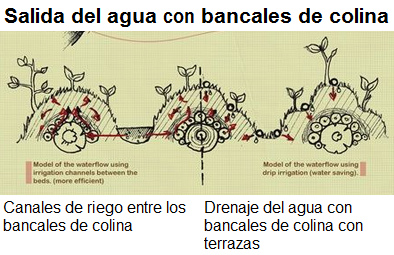 [46] Permacultura, el flujo de agua en la ladera de bancales de colina con un canal entre los bancales o con terrazas: