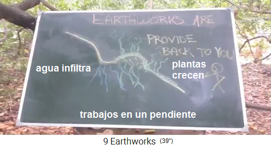 Las laderas secas se revitalizan con pequeñas zanjas y diques que hacen que el agua de lluvia poco frecuente se filtre en el suelo en lugar de fluir por la ladera seca y dura y perderse. Este es el principio de Sekar en el centro de permacultura "Magic House" de la India: captar, ralentizar, empapar, almacenar agua en el suelo [web10 - 16-26''].