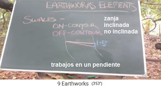 Zanjas de infiltración horizontales (ingl. on contour): toda el agua se infiltra en el lugar. Zanjas de infiltración inclinadas (ingl. off contour) tienen un desnivel de 1 a 5 grados, la mayor parte del agua se filtra (3'56''), una pequeña parte fluye por la zanja (3'59'') y termina, por ejemplo, en un estanque (4'17'').