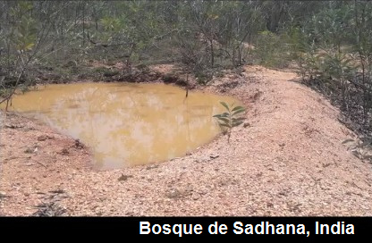 [21,22,23] Bosque de Sadhana (Sadhana Forest) en India, reforestación con anillos de agua alrededor de árboles: