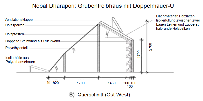 "Ein zweites Solargewächshaus wurde 2008 von RIDS-Nepal in ihrer Feldstation in Dharapori (2400 m Höhe) gebaut [Foto 1]. Das Gewächshaus basierte auf dem GERES-Entwurf, allerdings mit einigen Anpassungen; die in Ladakh verwendeten Lehmziegel als Doppelwand mit Isolationsschicht dazwischen wurde ersetzt [durch eine Steinwand, eine Isolationsschicht und eine Ummantelung aus Holz]. Die Belüftung wurde variiert, indem die Ecken an den Vorderseiten geöffnet werden und hinten am Dach Oberlichter für den Abfluss der Heissluft eingerichtet wurden, um eine Überhitzung zu vermeiden.