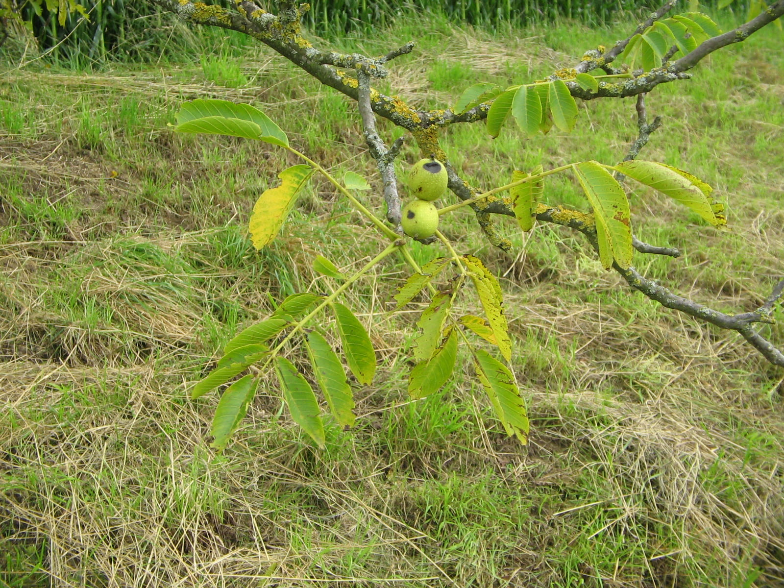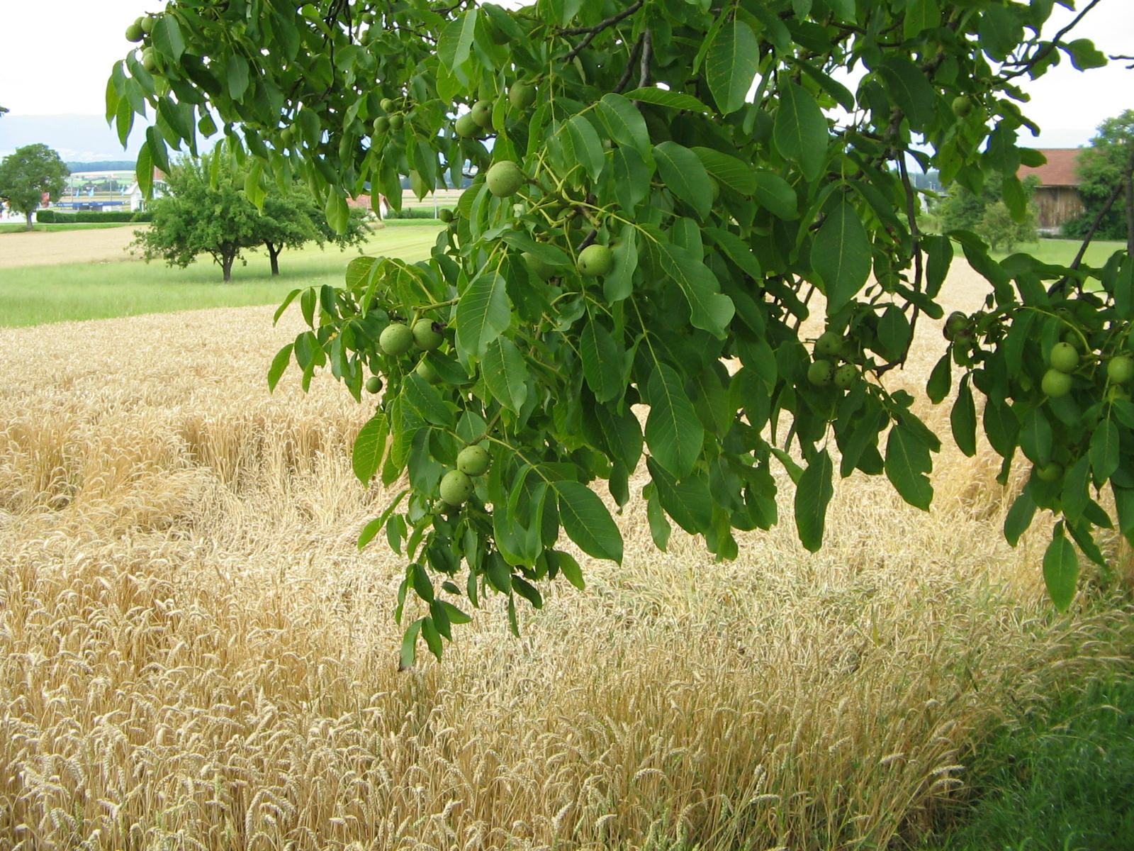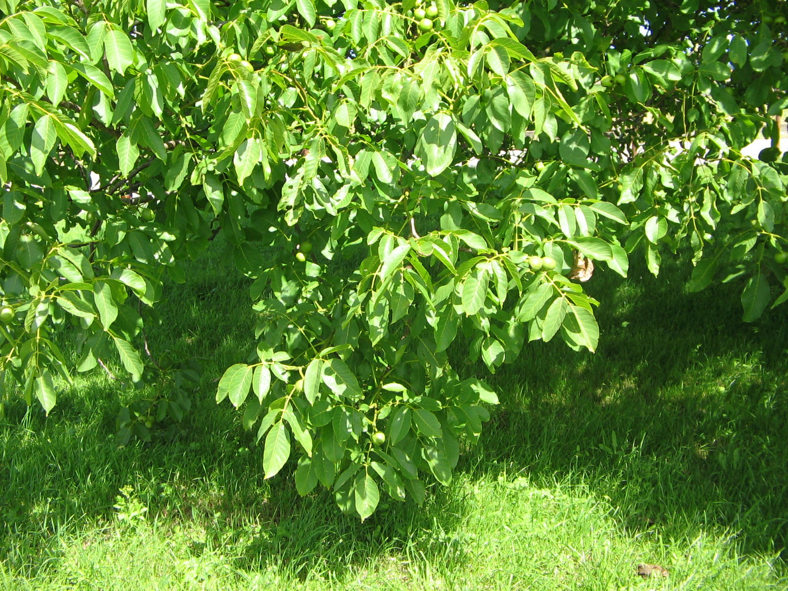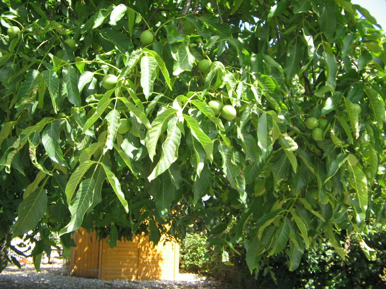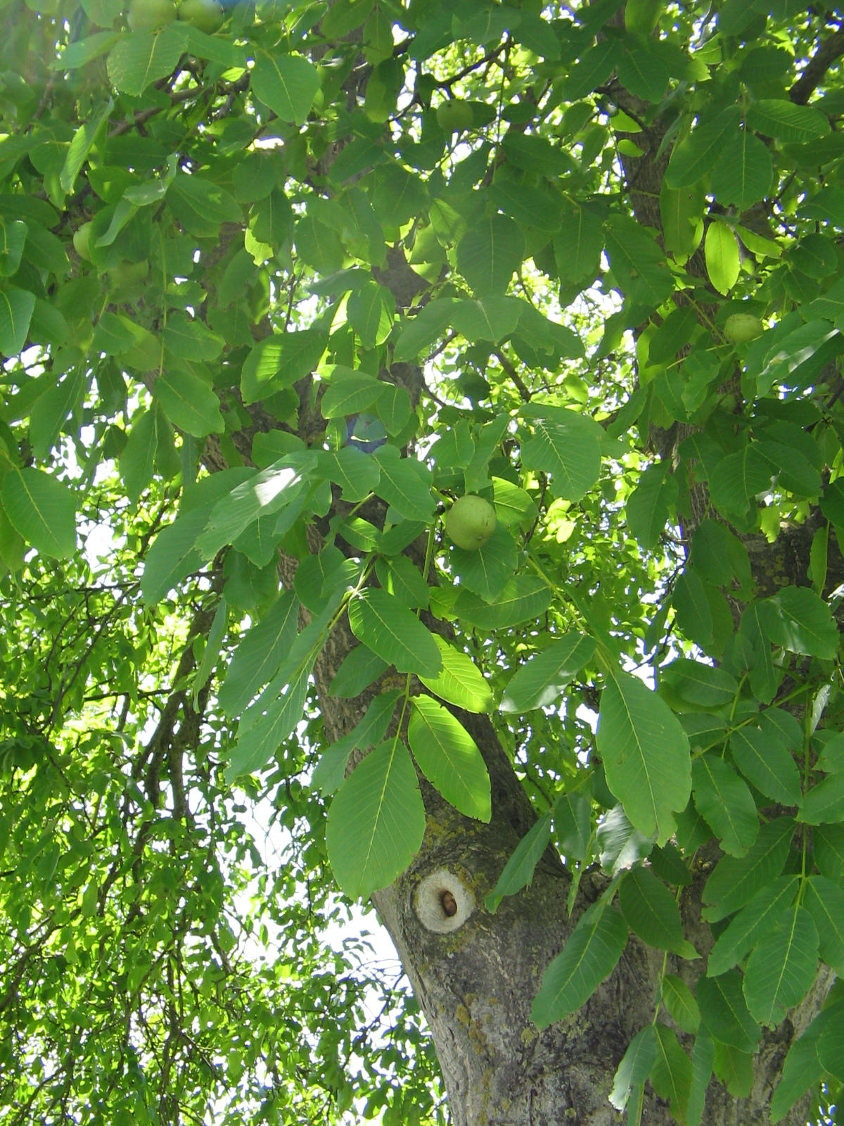Alter Nussbaum, Laub mit noch unreifen, grünen Nüssen
