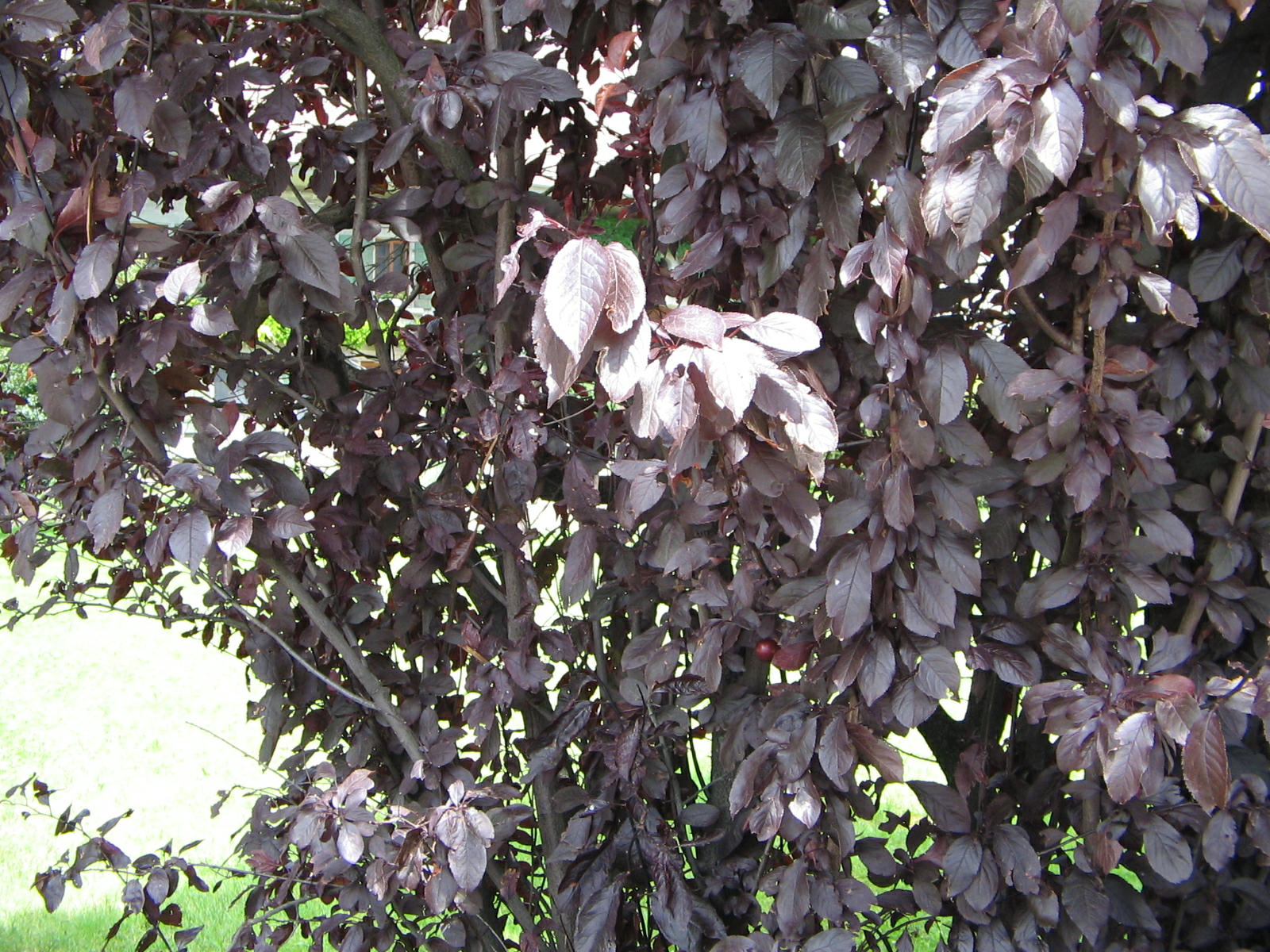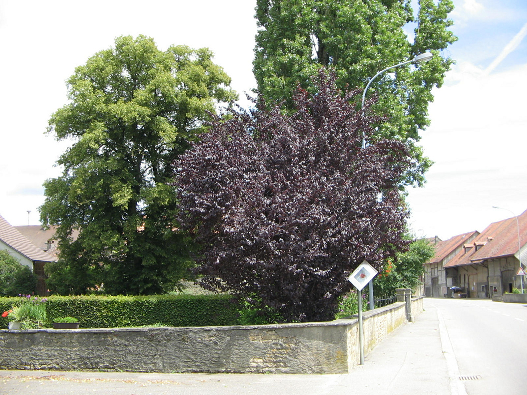 Route du Grand Chemin, Kunstkirsche mit weinroten Blättern, dahinter eine grosse Linde