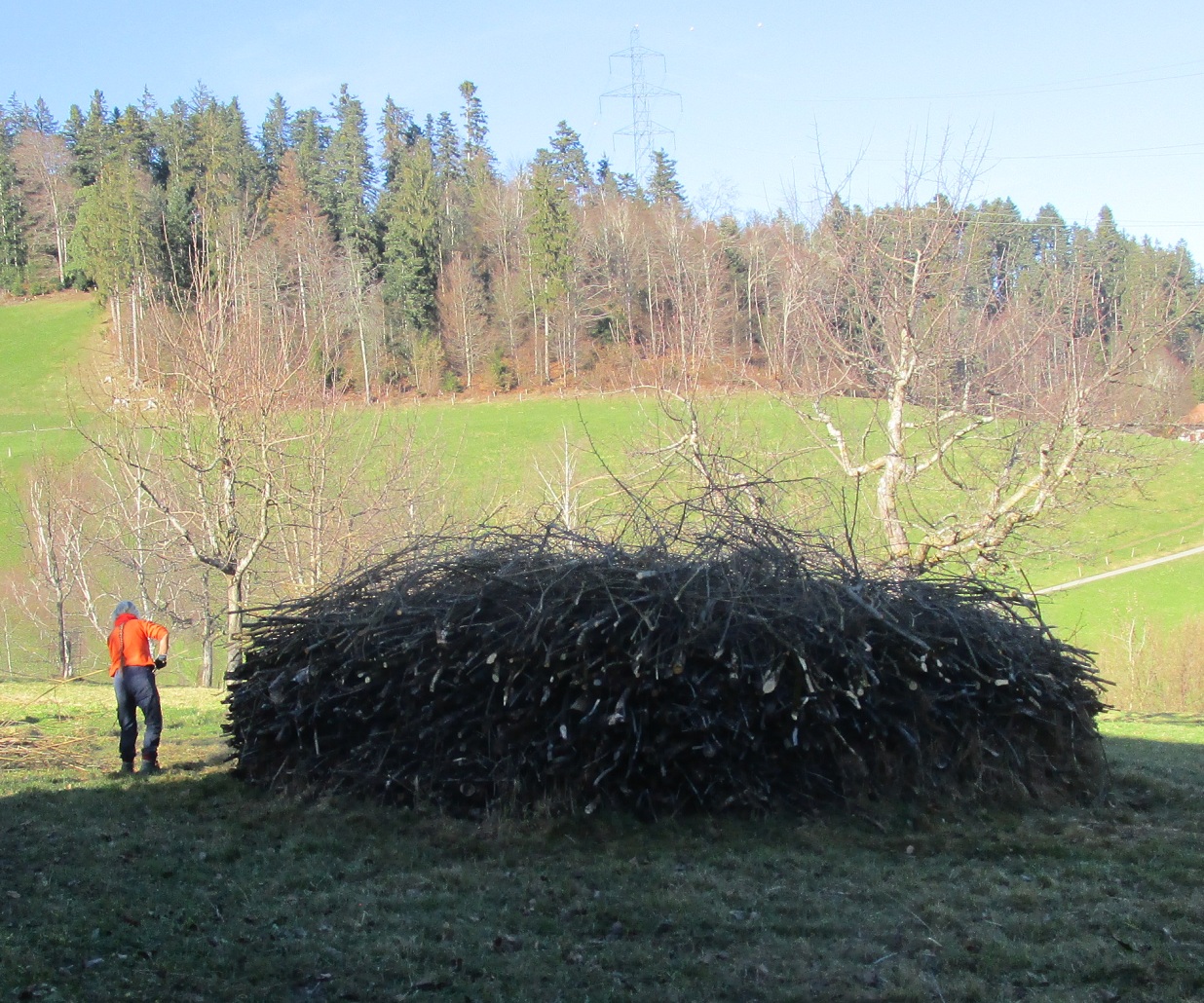 2. Dann wird der grosse Ast, der meistens auf anderen Ästen liegt, herangezogen, verkleinert und in Stücken durch das Geäst auf den Boden fallen gelassen