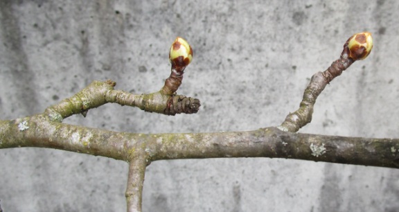 -- der Fruchtschnitt: reife, alte Triebe, die mal Blätter waren und nun Knospen sind, werden stehen gelassen, man lässt alle Knospen stehen, "auf Früchte schneiden" und nur die nach oben wachsen weg - wenn man das 30 Jahre lang so macht, ist der Baum nach 30 Jahren ausgepowert und nur noch Brennholz - man muss also abwechselnd auf Früchte und auf Laub schneiden - man muss auch genau wissen, welcher Baum die Jahre hindurch wie geschnitten wurde - [und wenn die Bäume nicht geschnitten werden, dann verwildern sie und verlieren ihre Energie in viel zu vielen Zweigen]