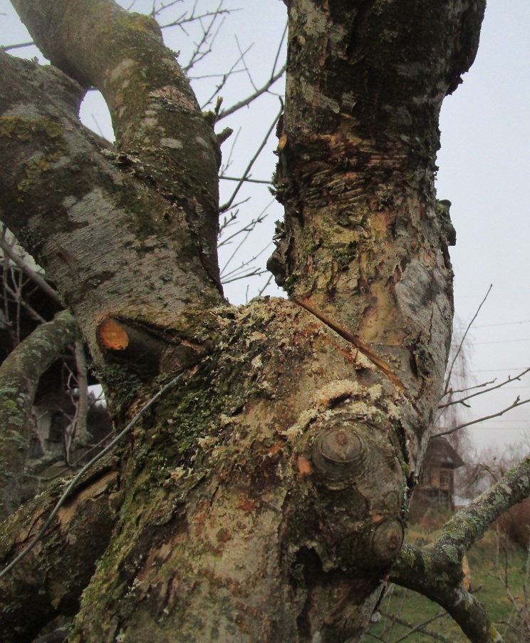 [16] Apfelbaum halb geschnitten, 28.Jan.2024 [15] - Sicht in den Apfelbaum, Schnitte am Stamm: M.P.
