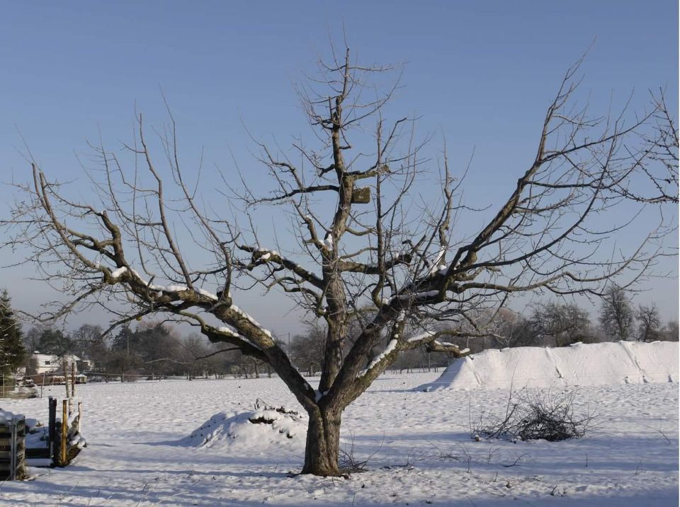 Ein verwilderter Kirschbaum: Die Äste sind viel zu lang+verzweigt, und der Schnee hat einen grossen Ast gebrochen [43]