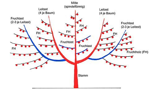-- die unteren Leitäste sollten am weitesten nach aussen schauen, die Äste darüber sollten nie so weit nach aussen reichen, um Schatten auf die unteren Äste zu vermeiden