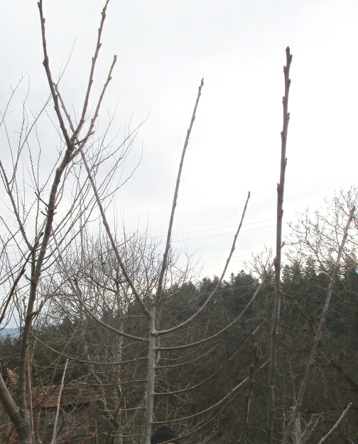 -- starke Äste, die steil nach oben zeigen, werden sich neigen und geneigt, wenn sie Früchte tragen, dann werden sie fast horizontal weiterwachsen - wenn dieser Ast einen Spross bildet, wird auch der sich neigen und fällt dann auch, wenn er Früchte trägt, man muss also die steilen Äste im jungen Alter des Baumes nicht zu viel abschneiden