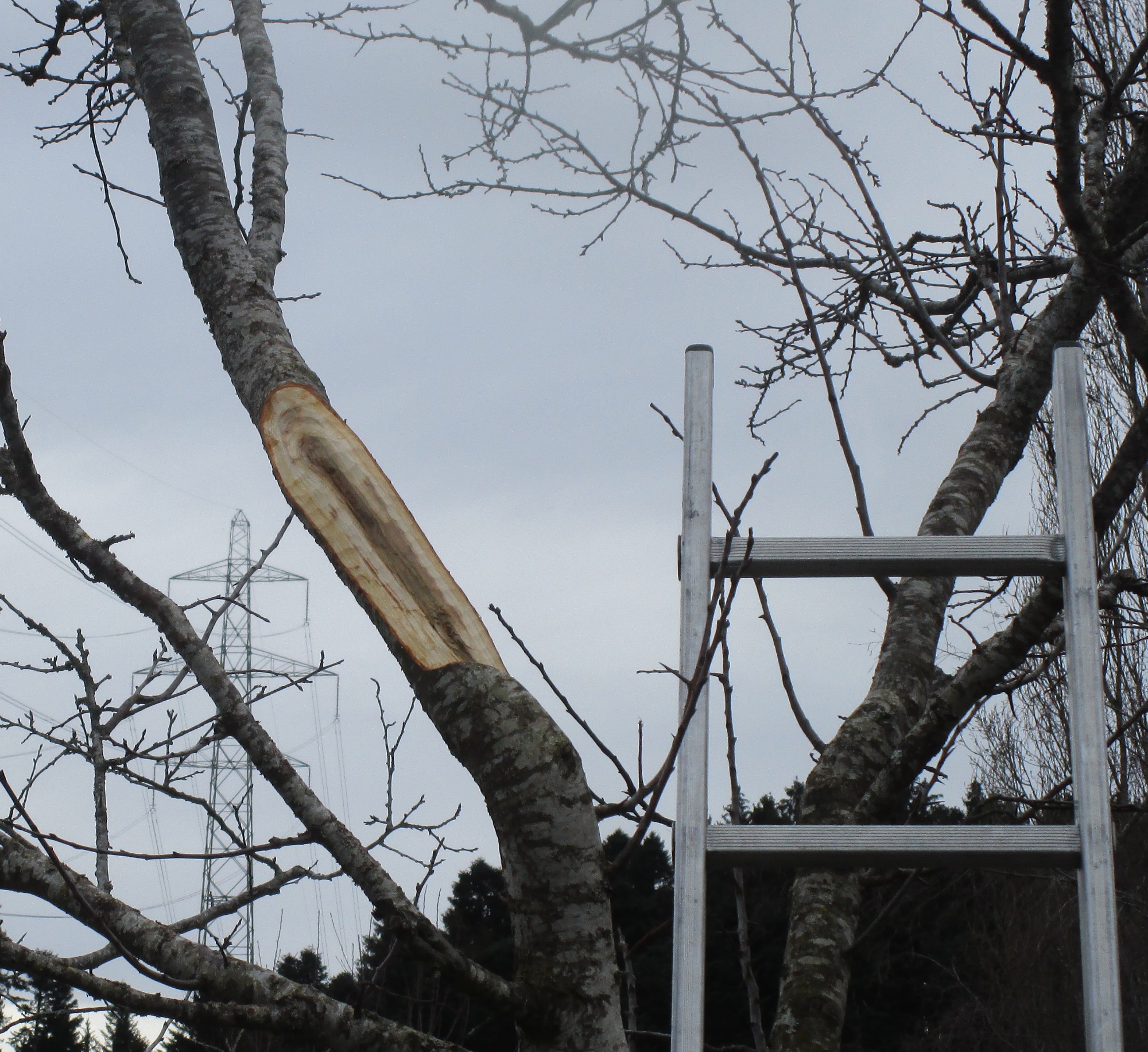 [45] Die Bruchstelle am Kirchbaum ist nun stromlinienförmig ausgebessert, damit der andere Teil der Gabel weiterwachsen kann und die Wunde verheilt: M.P.