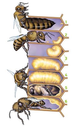 [7] Entwicklung der Biene in der Wabe vom Ei bis zum Schlüpfen: https://www.pinterest.com/pin/140806230630817/