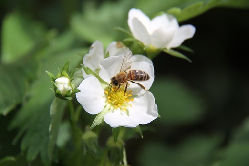 [33] Biene an Erdbeerblüte: https://pixabay.com/photos/strawberries-tree-bee-flower-spring-4150656/