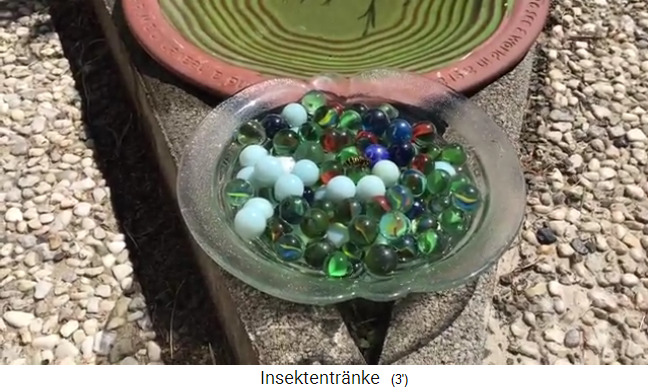 Insektentränke mit Glasschale mit Wasser und Murmeln