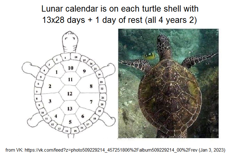 Jan 3, 2023: Lunar calendar with 13x28 days is on each turtle shell - photos with text vertically  [5]