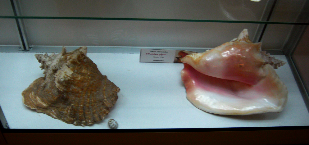 Strombus gigas, vista total; Familia: Strombidae; Región: Indopacífico; cambia la forma durante su crecimiento