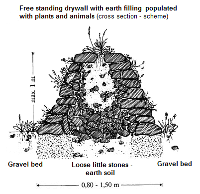 When a colonisation of the dry stone wall is wanted, the dry wall must have a direct connection to the ground, at the bottom [with or without a gravel bed] and at the rear with earth contact. So the dry stone wall has a "green foot" and a "green head" as food basis, as hunting ground and as locomotion space [web06, p.9] [and so animals can also dig themselves in for hibernation].