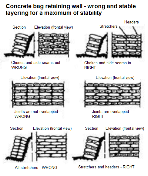 Cement bag wall layered safe or not safe, alternating long and short cement bags - graphic [41] - Cement bag wall with eye-shaped bags [42]