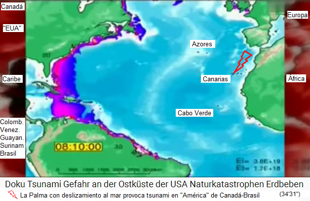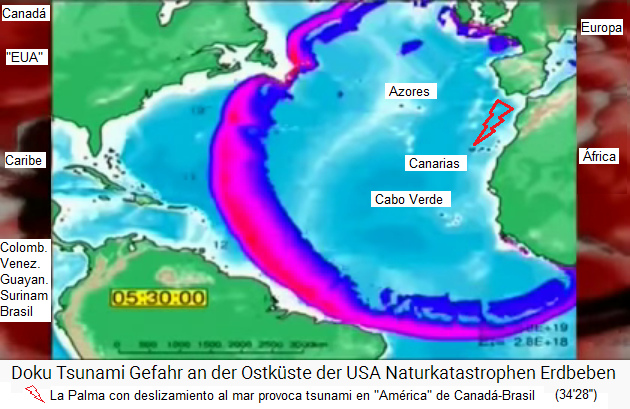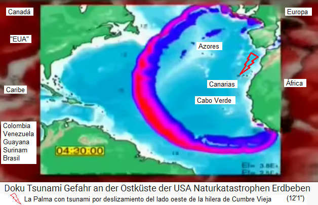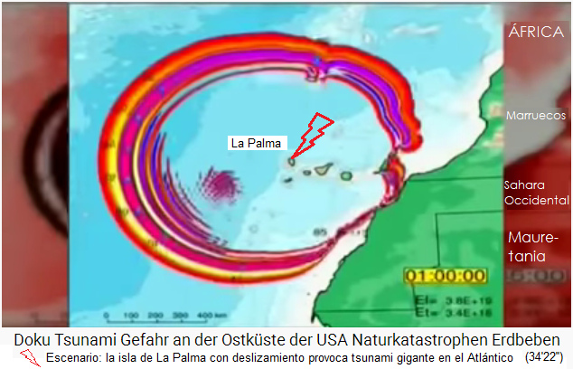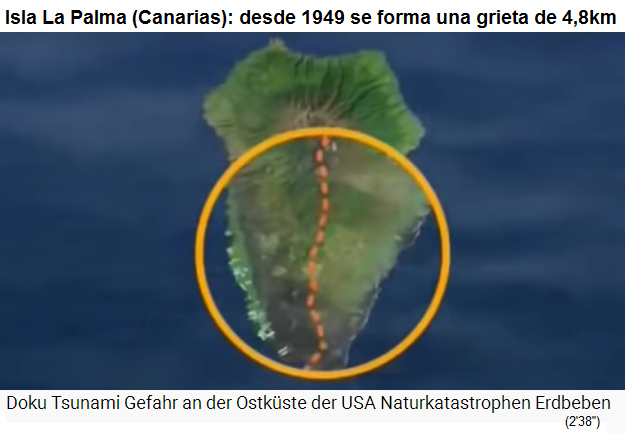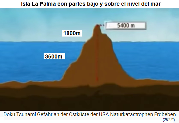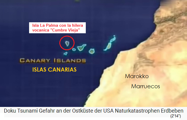 La causa del tsunami contra la costa este de "EE.UU." es el volcán de la isla de La Palma, una isla de las Islas Canarias cerca de la costa africana, las islas pertenecen a España (2'12''). La isla de La Palma tiene una cadena volcánica activa llamado "Cumbre Vieja" (2'17''). [Lo largo de esta cadena volcánica] en la isla se ha formado una grieta de casi 5 km de largo del norte al sur (2'35''). Si el volcán entrara en erupción, una parte entera de la isla podría desprenderse y caer al mar, la parte del flanco volcánico en cuestión tiene 16km de largo y 1600m de alto (2'55''). Esto podría desencadenar una ola marina (tsunami) con una altura inicial de 300 m (3'0'').