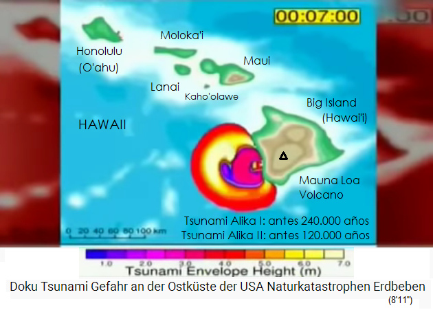En el fondo del mar, los campos de escombros frente a Hawai bajan hasta a una profundidad de 4000m (8'38''), por lo que las rocas que cayeron allí son en parte. roques tan altas como una casa (8'43''). El tsunami golpeó la isla de Lanai, 160 km al norte, el tsunami fue de 180 a 300 m de altura, estas altas olas del tsunami actuaron como lluvia, no solo con agua de mar, sino también con rocas grandes del fondo marino, con peces, algas, conchas y arena (9 '18' '). Entonces, hay capas terrestres que se pueden fechar con precisión, y ahora se puede concluir qué pasaría si una ola gigante golpeara la costa este de los "EUA" (9'40'').