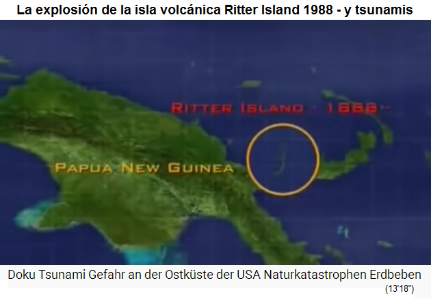 La isla Ritter frente a Papúa Nueva Guinea tuvo una erupción volcánica en 1888, el pequeño volcán colapsó y provocó tsunamis en todas direcciones. Dr. Simon Day: Los colonos de entonces hicieron dibujos de la isla vieja, hoy solo queda un pequeño casco (13'37''). Dr. Steven Ward: el 95% de la isla cayó al mar, el tsunami con una altura de 9 a 15 m destruyó las costas alrededor, matando a 3000 personas (13'59'').