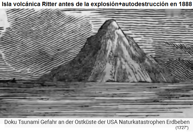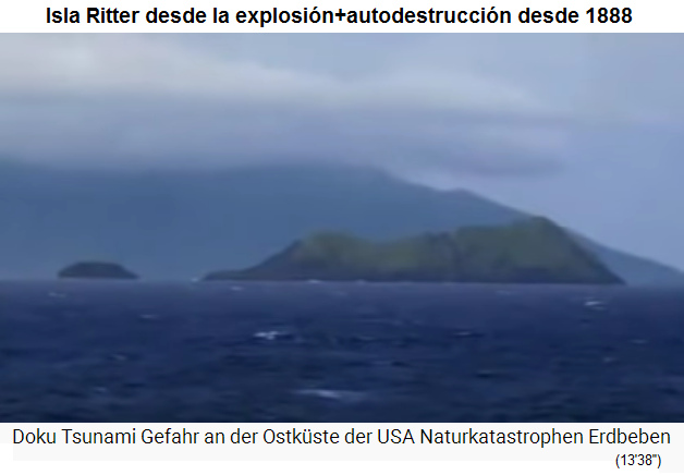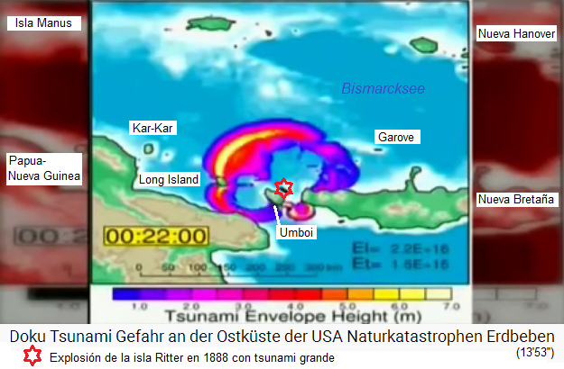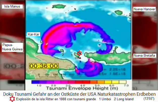 Entonces, los colonialistas de fantasía de Jesús vivían en el área alrededor de la isla Ritter, tenían sus relojes de bolsillo y observaron exactamente cual ola de tsunami llegó, cuándo y a qué altura (16'57''). La investigación en la isla Ritter puede reconstruir exactamente cuándo llegaron los tsunamis a cual isla vecina (17'38''). Se desarrolló un modelo computarizado con estos datos, y ahora los investigadores creen que podrían predecir tsunamis (17'59''). En consecuencia, es así: si el volcán de la isla canaria de La Palma se derrumba y cae al mar, las costas de África, Europa y "América" están muy amenazadas (18'16'').