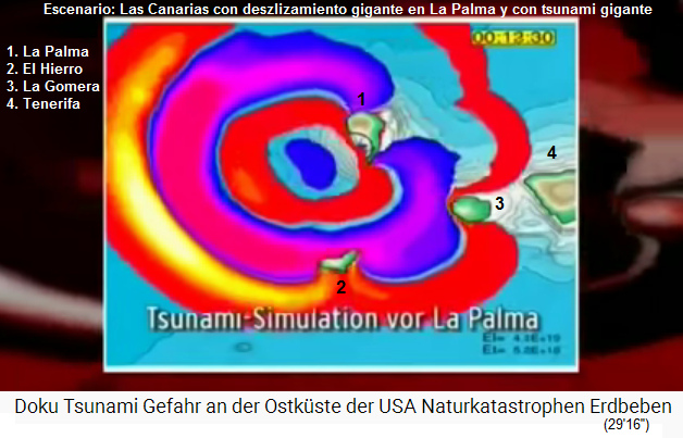 Los experimentos computarizados de los advertidores de tsunami - los Señores Ward y Day - se ven así: Las Islas Canarias serán destruidas, al igual que la costa este de "América" al otro lado del Atlántico (5'11''). Llegan olas de 20 a 40 metros de altura, teniendo en cuenta la gravedad y la fricción o la resistencia del viento (5'55''). Ward y Day tienen los datos de explosiones reales de islas volcánicas, han desarrollado un modelo computarizado y lo han aplicado a la región de la isla de La Palma (6'2''). Ellos tienen los datos de la explosión de la isla Ritter frente a Nueva Guinea en 1888, cuando aproximadamente 1 1/2 km3 de roca cayó al mar (6'22''). Las olas provocadas tenían 50 m de altura, destruyeron las costas vecinas en 100 km de distancia todavía (6'38''). En el modelo computarizado de Day y Ward se incluyó también los datos de los testigos de la época de los tsunamis (6'45''). Los tsunamis de onda corta, por lo tanto, pueden retener su energía a largas distancias (6'55'').