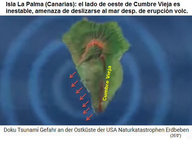 En 1949 hubo una larga erupción volcánica en la isla de La Palma (en las Islas Canarias) formando muchos nuevos cráteres pequeños. Desde entonces, se ha formado una grieta de 4,8 km de largo a partir del volcán "Cumbre Vieja" en la parte sur de la isla, que hasta hoy (a partir del video de 2016) se ha convertido en 4,5 m de ancho, el deslizamiento es de 1 cm por año. Los investigadores del volcán, el profesor Ward y el profesor Simon Day, advierten que si hay una nueva erupción volcánica en la isla de La Palma con mucha agua en el volcán, existe el riesgo de que el flanco volcánico occidental deslizante explote y se hunda en el Atlántico (16km de largo, 1600m de altura y 300m de profundidad). Esto provocaría un gigantesco tsunami. Puede suceder en cualquier momento.