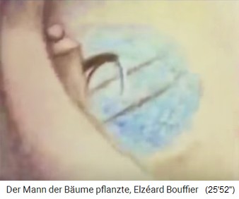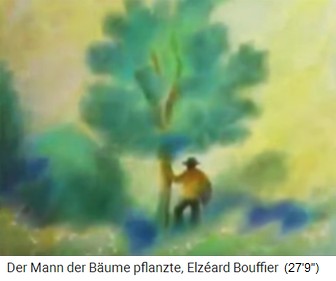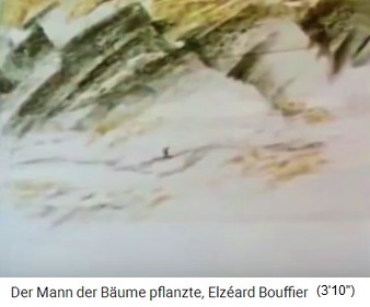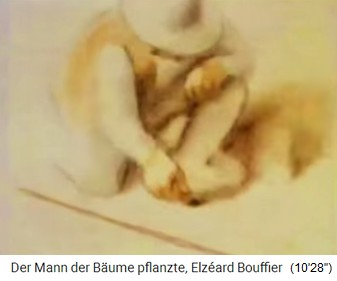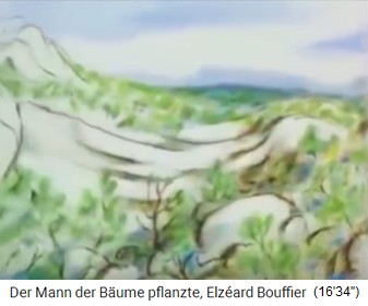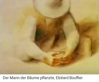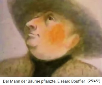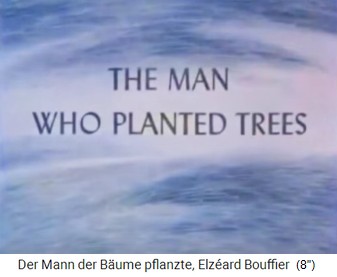 2a) "Der Mann, der Bäume pflanzte" / "Der Mann mit den Bäumen" - eine Kurzgeschichte von Jean Giono (13'').  -- 1913 (13'39''): Der Spaziergang von Jean Giono in den Südalpen - der Schäfer Elzéard Bouffier mit seinen Eicheln -- Die Pflanzung von Eichenwald: Loch mit Eisenstange - Eichel rein - Loch zudecken -- Erster Weltkrieg 1914-1918 - der Spaziergang in den Südalpen von 1919: 11km Eichenwald bis 3km breit, Buchen und Birkenhaine -- Der Eichenwald speichert das Regenwasser und der Grundwasserspiegel steigt an: Neue Quellen, Bäche fliessen wieder -- 1933: Die Provinzverwaltung entdeckt den "Wunderwald" in den Südalpen - 1935: Naturschutz und Köhlereiverbot -- 1939: Holzgasautos brauchen Holz - die Südalpen liegen zu weit weg und der Eichenwald bleibt stehen -- 1945: Die Wiedergeburt der Dörfer in den Südalpen durch den Eichenwald von Bouffier - Wasser bringt neues Leben - Beispiel Vergons -- Elzéard Bouffier machte über 10.000 Menschen glücklich - gestorben 1947