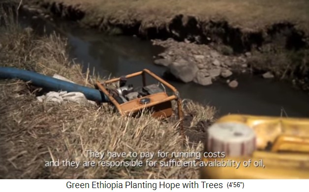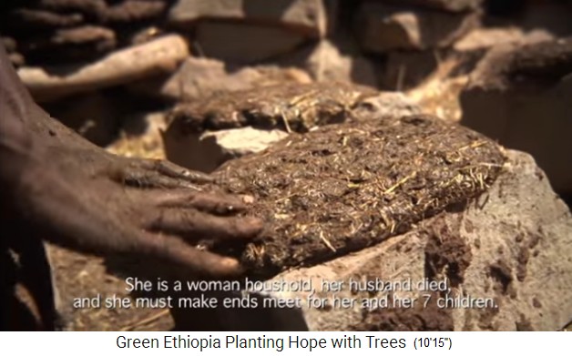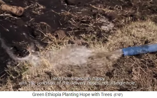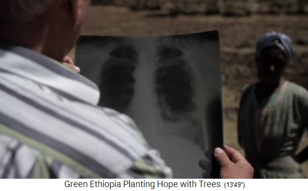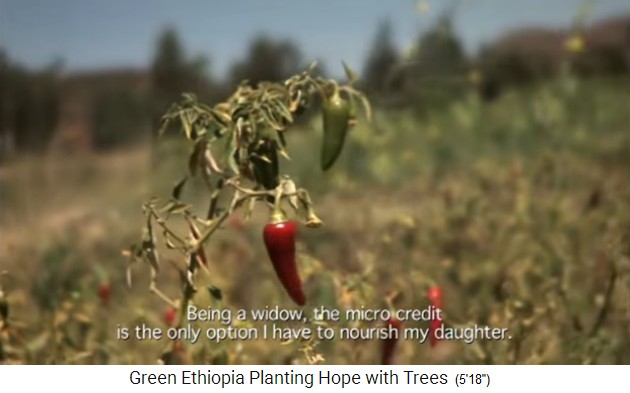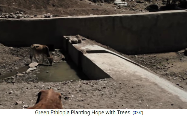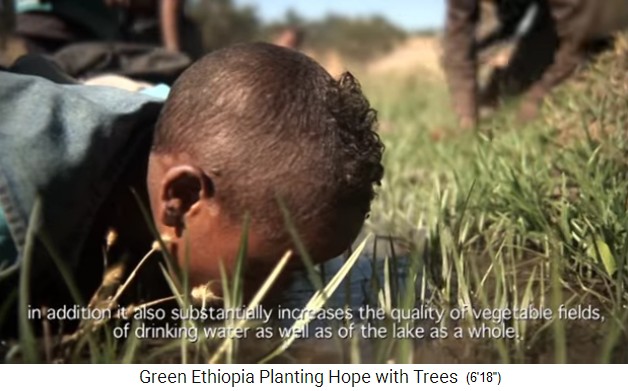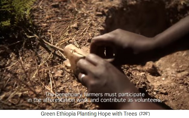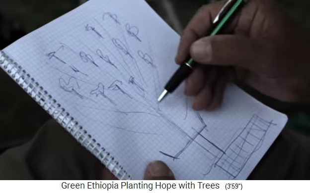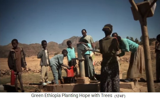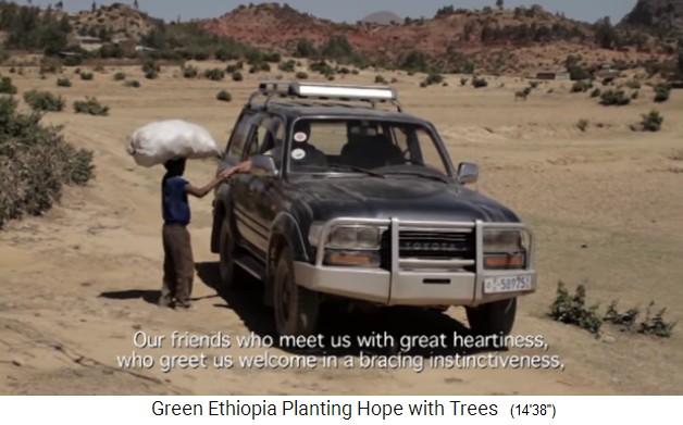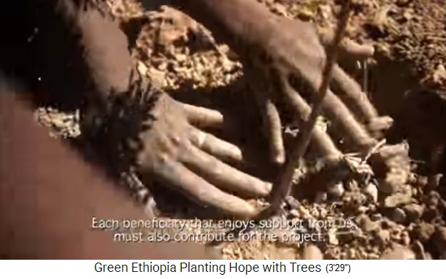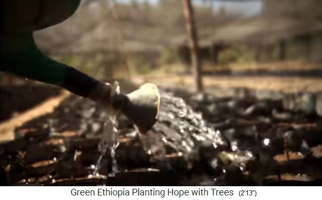 Es werden Löcher in die Wüste gehackt und die Setzlinge mit Komposterde hineingesetzt und das Loch mit der umliegenden Erde gut verschlossen (2'36''). Jedes Jahr werden in Äthiopien 4 Millionen Bäume gesetzt, so dass wieder Wälder wachsen und Quellen aus dem Boden sprudeln (2'42'').