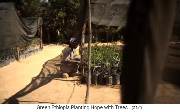 Sprecher: Vor 100 Jahren [ca. 1914] waren 40% von Äthiopien noch bewaldet (1'52''). Heute [ca. 2014] sind es noch 3% (1'57''). Als erstes werden Baumschulen in Dörfern angelegt, und die Bewohner werden in Zusammenarbeit mit ökologischen Behörden geschult, wie man heimische Bäume als Setzlinge züchtet (2'16''). So lernt die Bevölkerung, Setzlinge zu züchten und zum Wachsen zu bringen (2'26''). So werden in einer Baumschule mit Komposterde z.B. pro Jahr 100.000 Baumsetzlinge gezüchtet (2'32'').