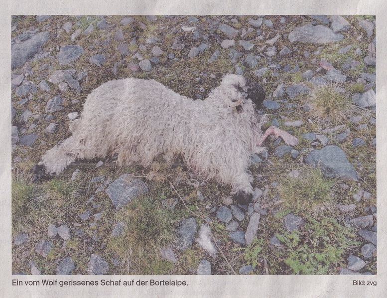 [1] Wölfe sind ÜBERFLÜSSIG - z.B. im Kanton Wallis (Schweiz) am 14.8.2023: Laufend werden Schafe geköpft - und die Schäfer ziehen ab+das Raubtier "Wolf" GEWINNT! - Weiterer Wolfsangriff in der Simplonregion- kommts zum Abschuss? aus: Walliser Bote, 14.8.2023 - S.5