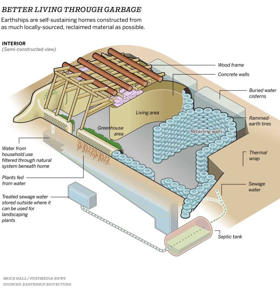 An Earth Ship uses all kinds of recycling techniques in terms of building materials and is completely self-sufficient and independent: