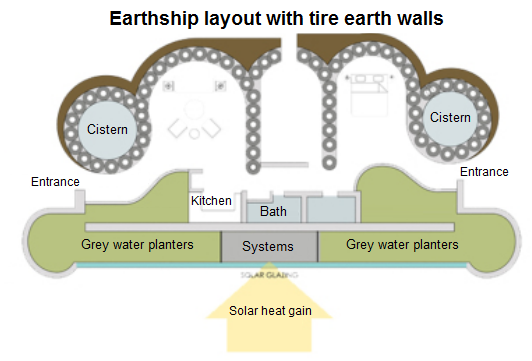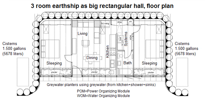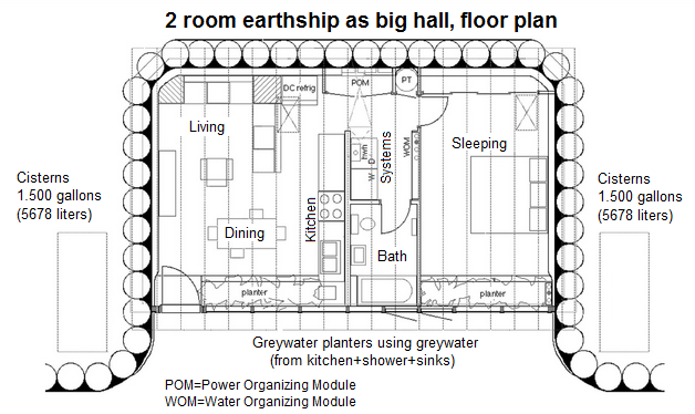 [9] The ground plan of an earthship with tire-earth walls with two cisterns on the sides and plant area on the window front: