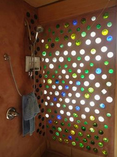 Aluminum cans in partition walls in an earthship in Spain [12] - Bottle rosette in a partition wall of an earthship in Spain [13] - Interior wall with bottle pattern of a spiral in blue and white [16] - Interior wall with bottle pattern in white, blue, green and yellow [17 ]