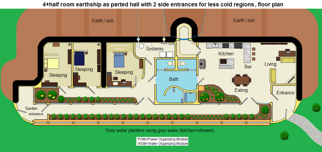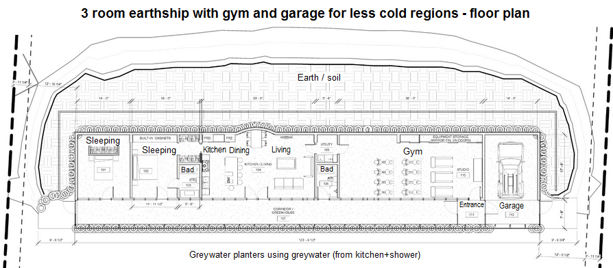 [30] 3-room earthship with gym and garage, rectangular hall, floor plan: https://www.arch2o.com/earthships-michael-reynolds/