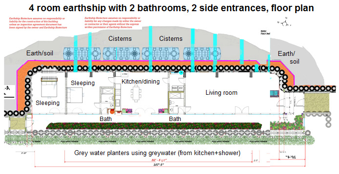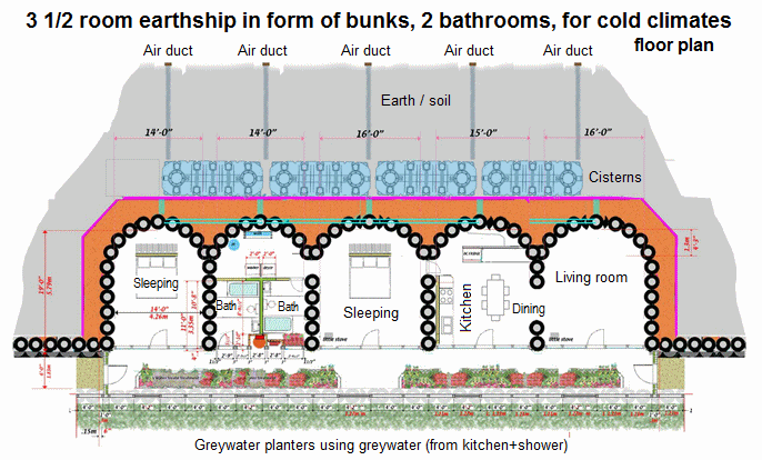 [29] 3 1/2-room earthship with 2 bathrooms in bunks for cold climates, floor plan: https://www.arch2o.com/earthships-michael-reynolds/